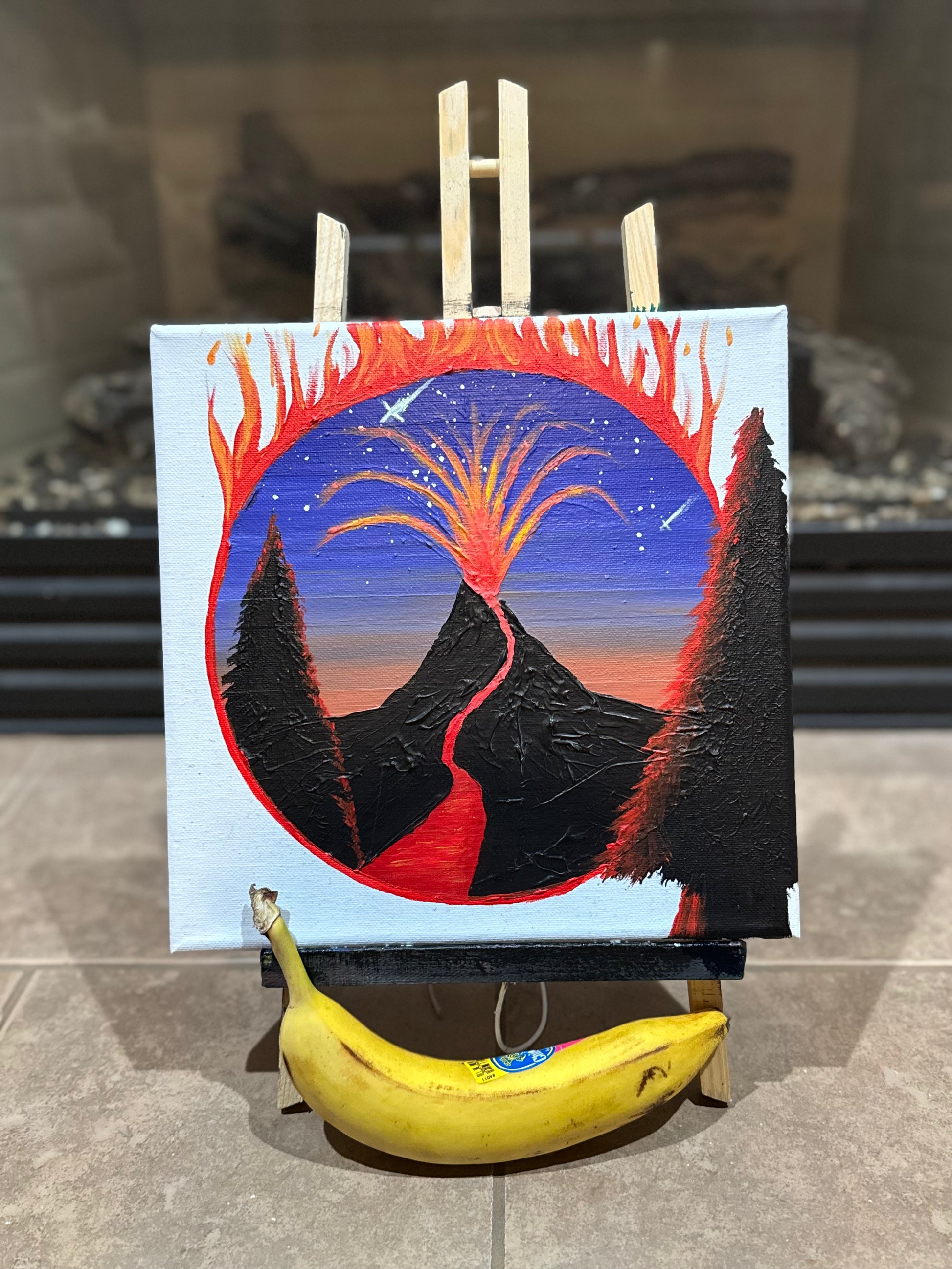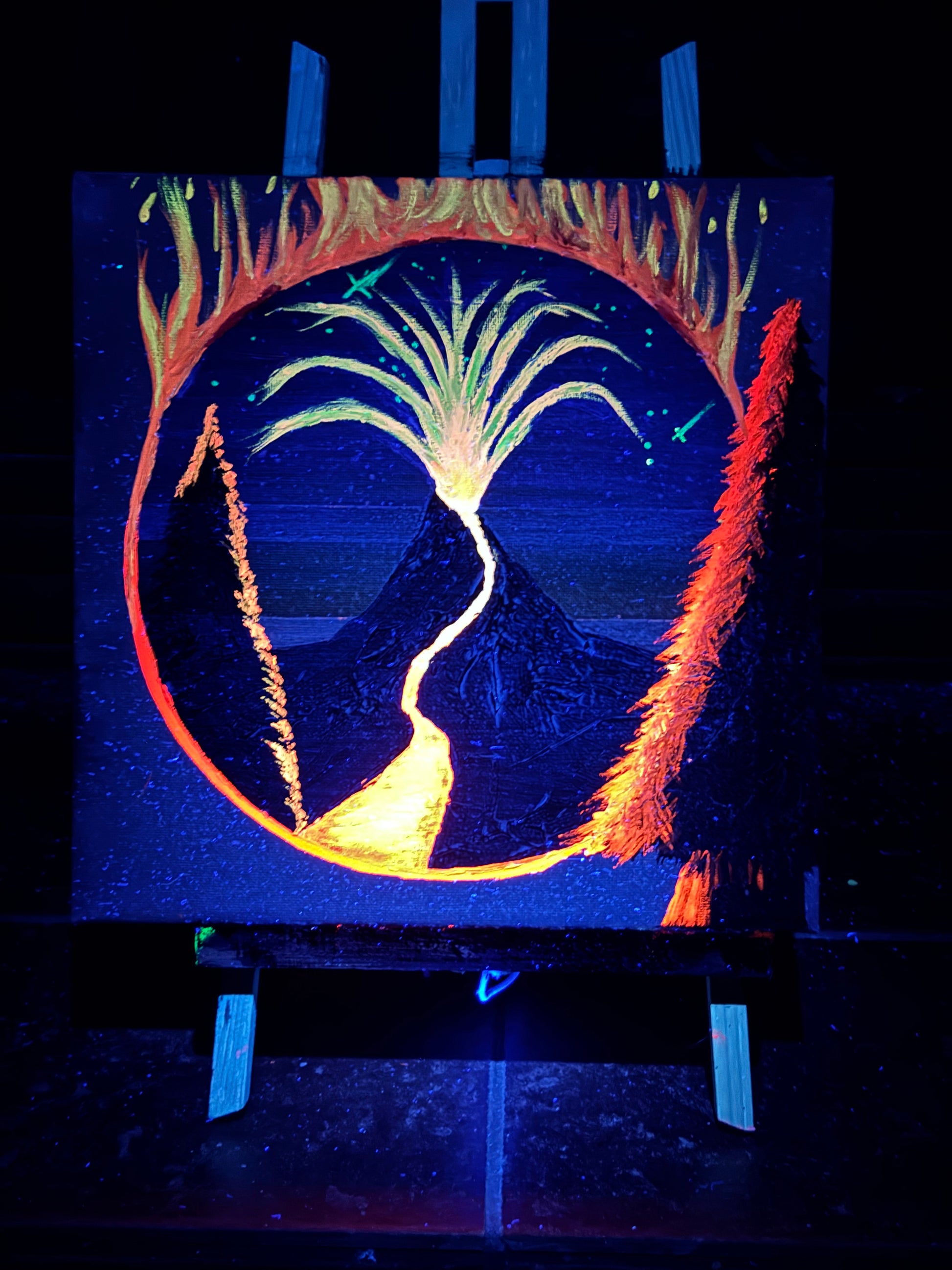 Acrylic painting of a volcano using fluorescent colors. Blacklight picture taken with a 365nm UV light.