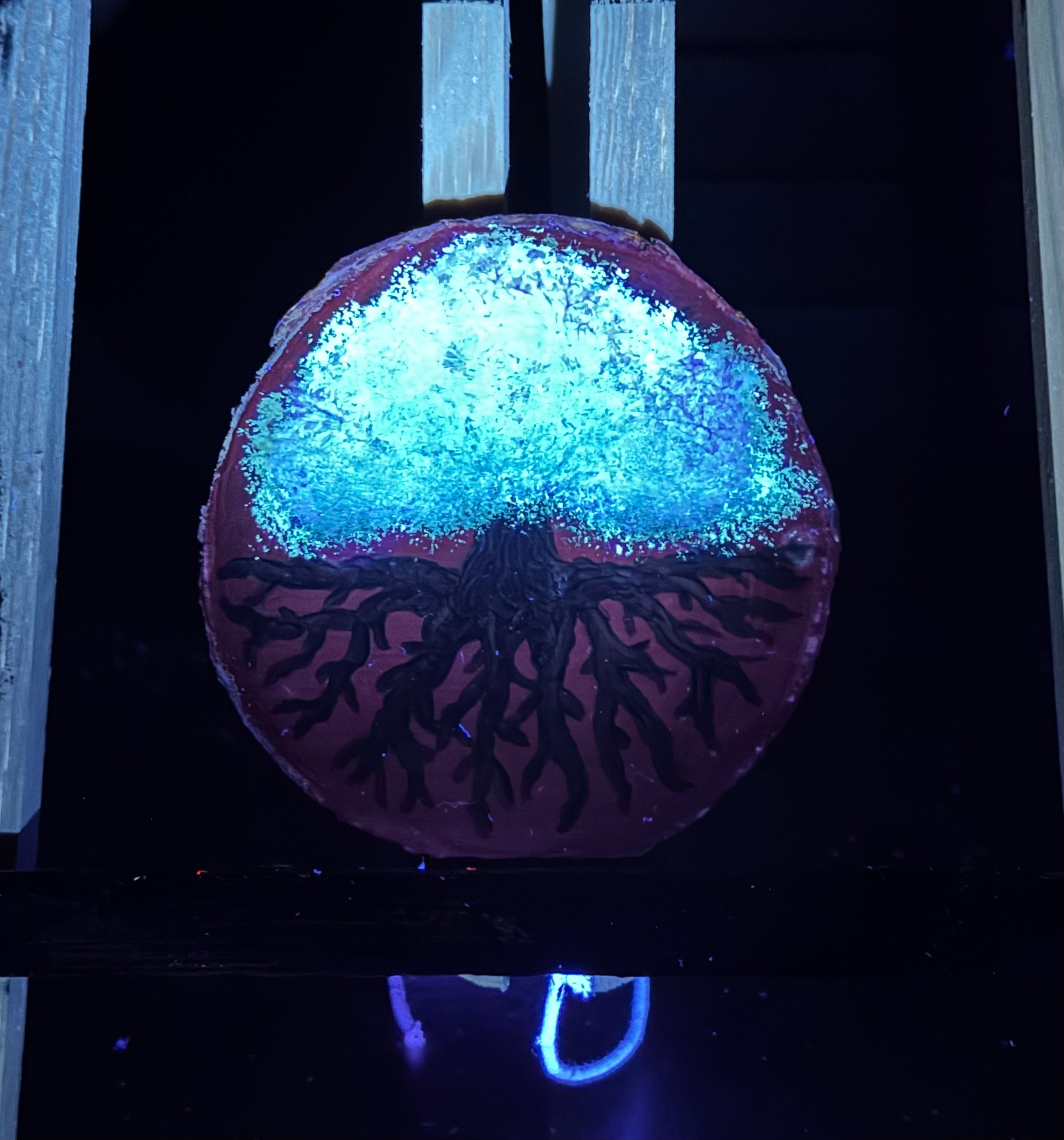 A medallion, coaster, or decorative piece made of wood featuring a fluorescent green tree acrylic painting. Coated in lacquer to resist moisture and the elements. Blacklight picture taken with a 365nm UV light.