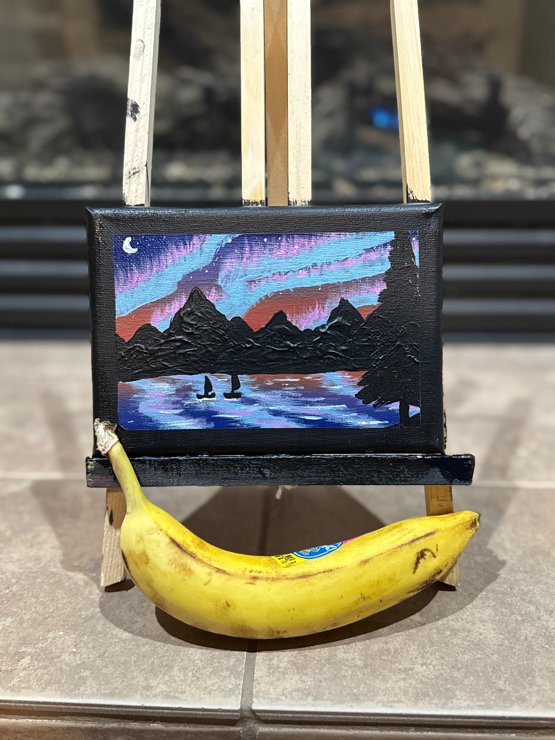 Acrylic painting of an aurora in the northern skies.