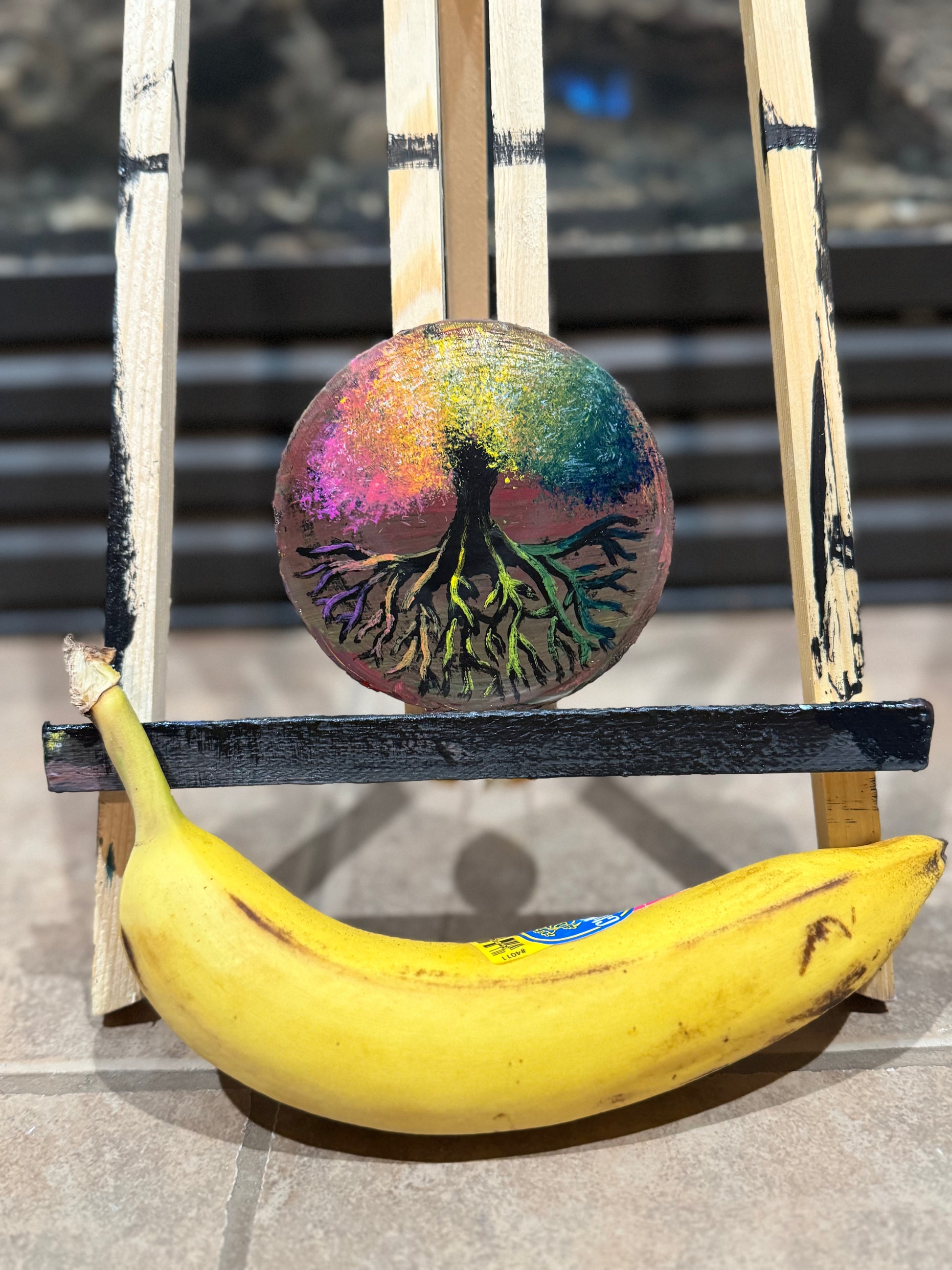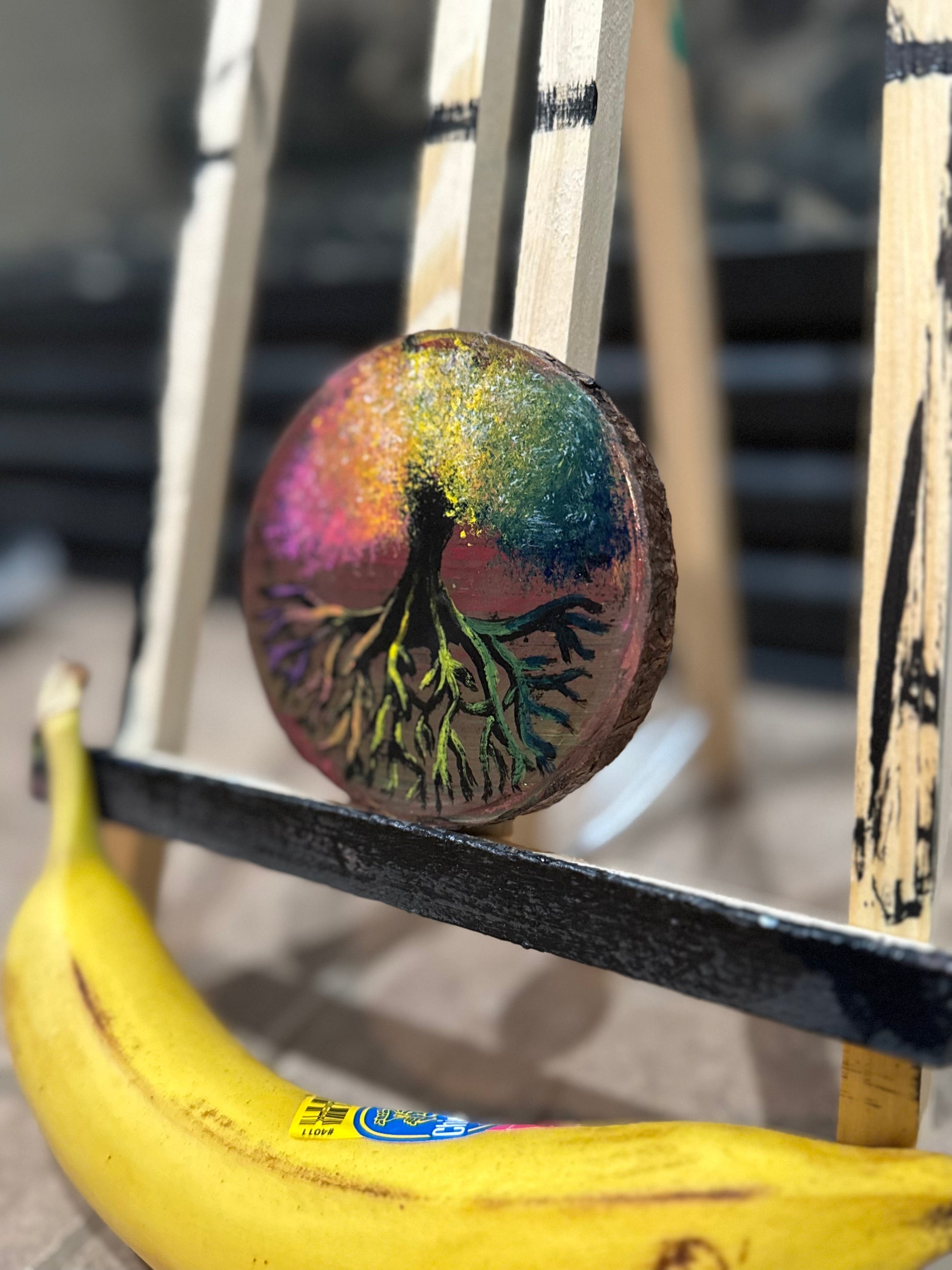 A medallion, coaster, or decorative piece made of wood featuring a Tree of Life acrylic painting. Coated in lacquer to resist moisture and the elements.